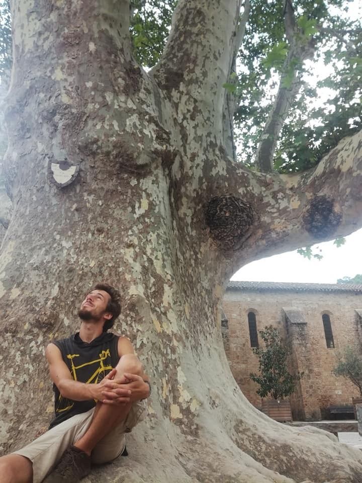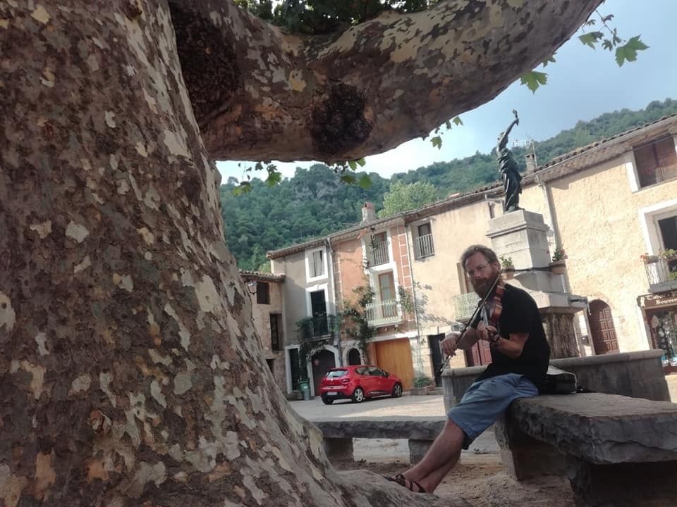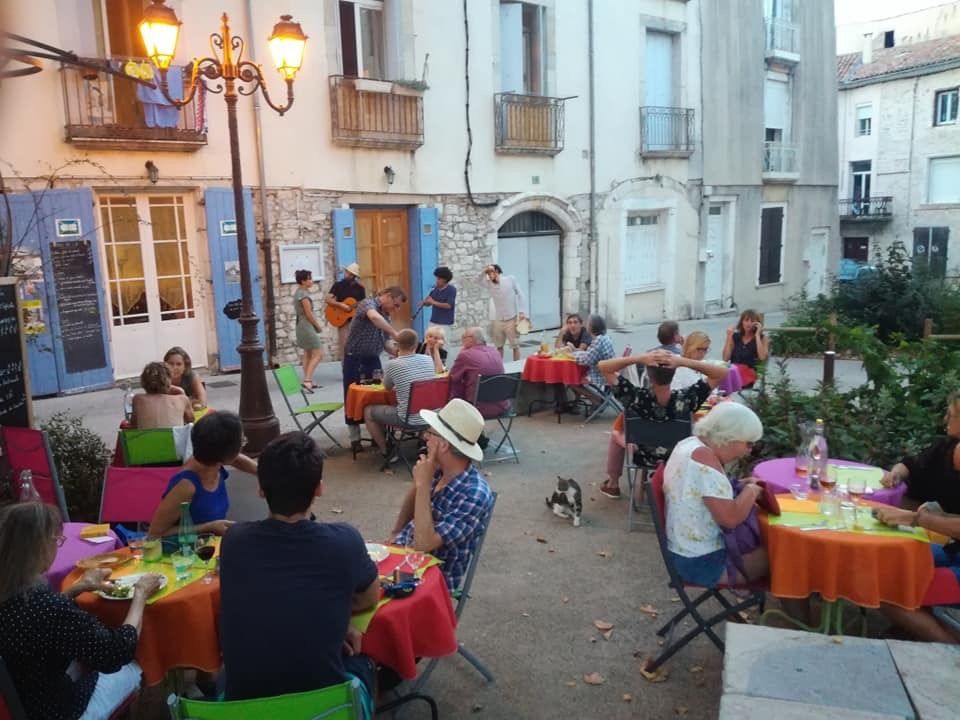 Nous sommes à St Guilhem le Désert devant la brasserie de Delphine. Assis sur la ruelle.