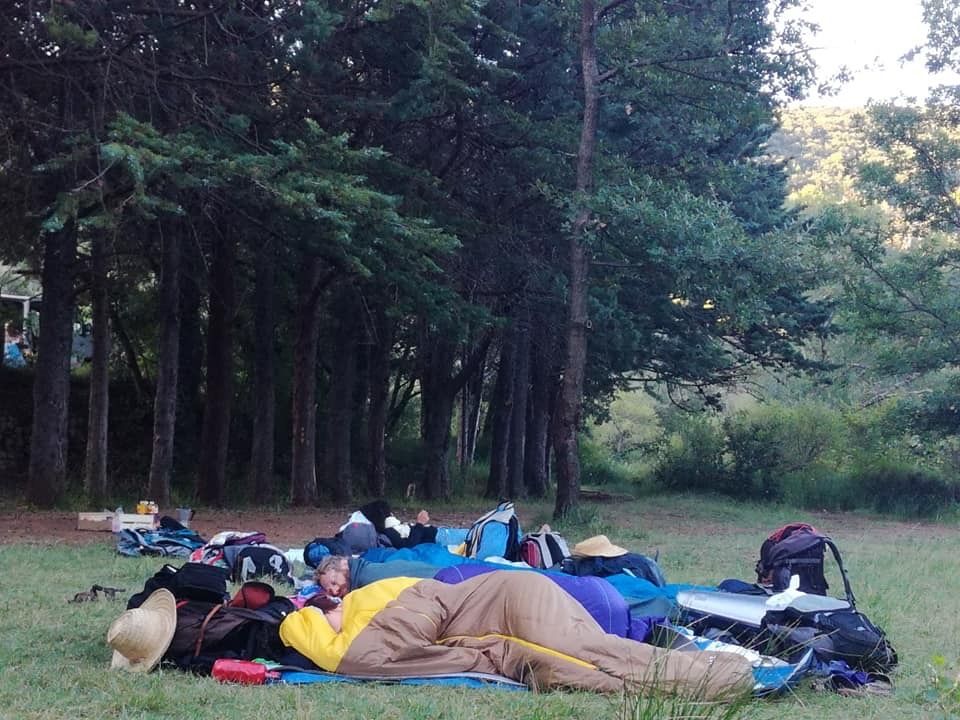 3ème jour. 1ère réunion "organisée", Aziz est à la manœuvre. Après une nuit et une soirée chez Marie-Pierre, nuit sur les tapis ou nuit sous les étoiles. 3,8 gouttes d'eau n'ont pas effrayé certain-es qui ont bavé les intempéries. Planifier est devenue une nécessité, trop d'aventures ? Au loin le hamac creuse son trou progressivement jusqu'à la table. Plus rien ne bouge. Les corps s'apaisent repus.